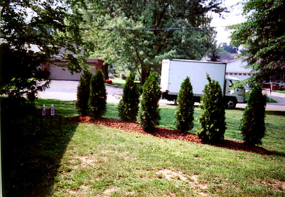 The view from the customers' patio. This planting will close in completely within two to three years and fully mature in 7. All steps were taken to make sure of quick performace.Ammended soil and 3-4" layer of pine mulch will insure maximum root and top development when the plants "flush out" next spring :) |