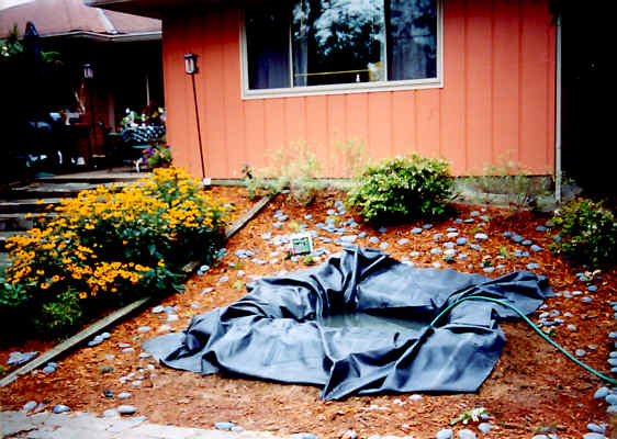 The customers wanted a water feature for the sound and ambiance. There were several laundry tubs sunk into the ground here when we started. They wanted a nice home for their new lotus plant so we created a small pond with a 30" deep center to accomosate the lotus and 12" deep side shelves for marginals. A small recirculating pump was also added for a soft rippling sound effect.