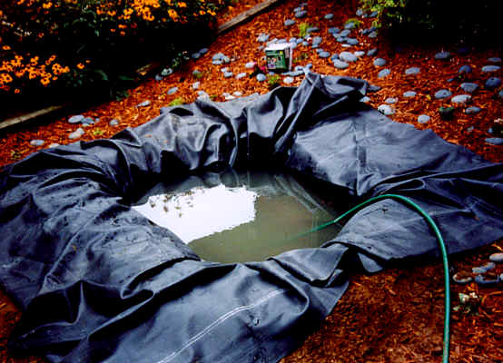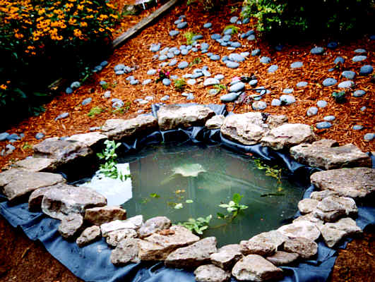 The customers wanted a water feature for the sound and ambiance. There were several laundry tubs sunk into the ground here when we started. They wanted a nice home for their new lotus plant so we created a small pond with a 30" deep center to accomosate the lotus and 12" deep side shelves for marginals. A small recirculating pump was also added for a soft rippling sound effect.
